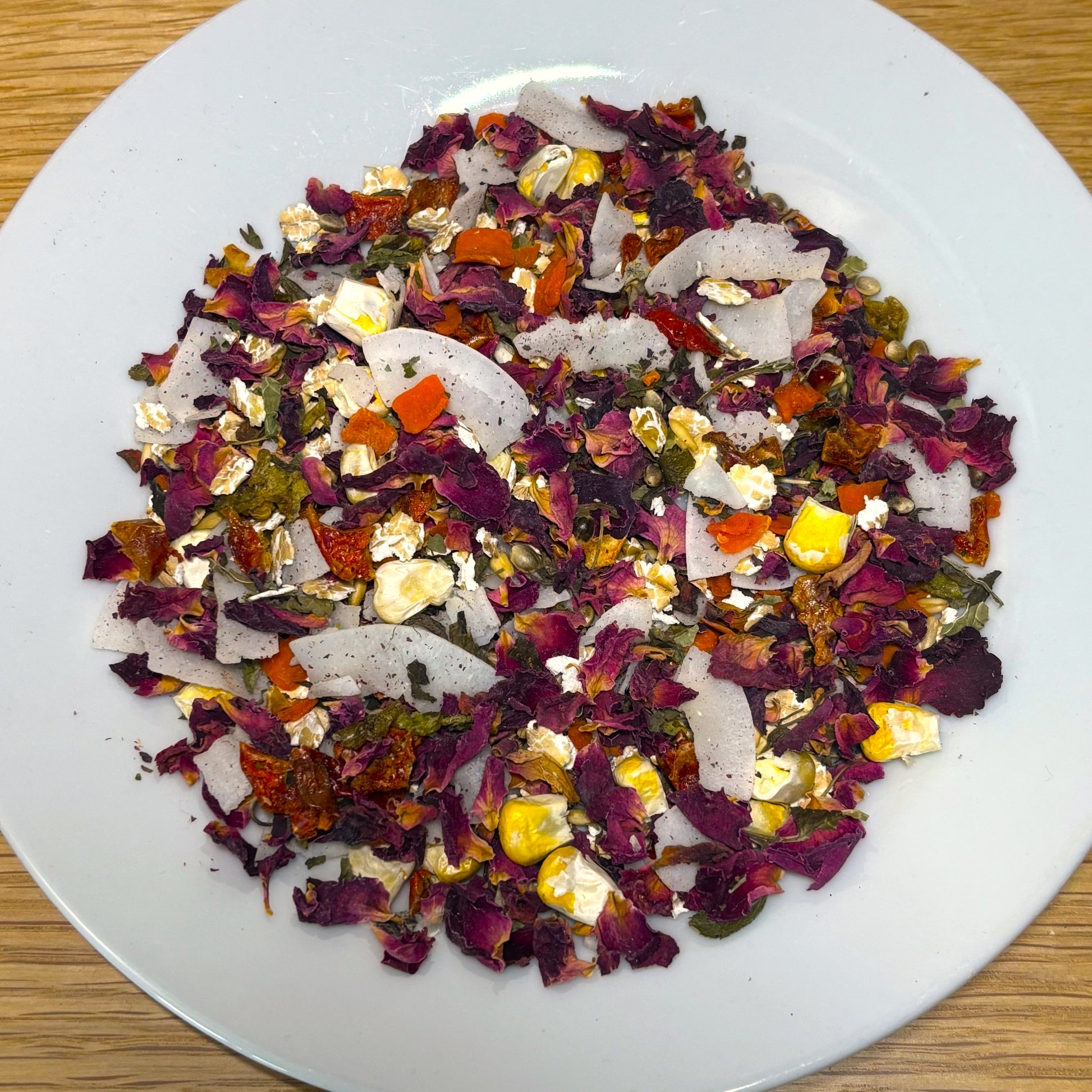 Oat Groats, Red Pepper Flakes, Carrot Flakes, Rose Petals, Barley Flakes, Coconut, Hemp Seed, Freeze Dried Sweetcorn, Lemon Balm, Green Pepper Flakes.